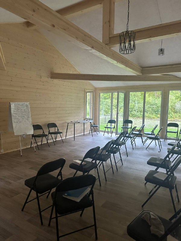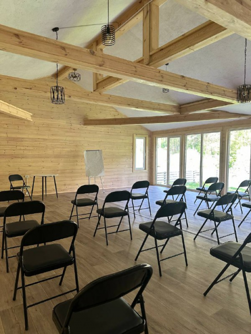 Светлый и просторный конференц-зал площадью 100 м², идеально подходит для проведения йога-туров, ретритов, групповых занятий, встреч и мероприятий. Зал полностью оснащён всем необходимым для комфортной работы и практик. Большие панорамные окна наполняют пространство естественным светом и открывают живописный вид на сосновый бор, создавая атмосферу спокойствия, уединения и концентрации.